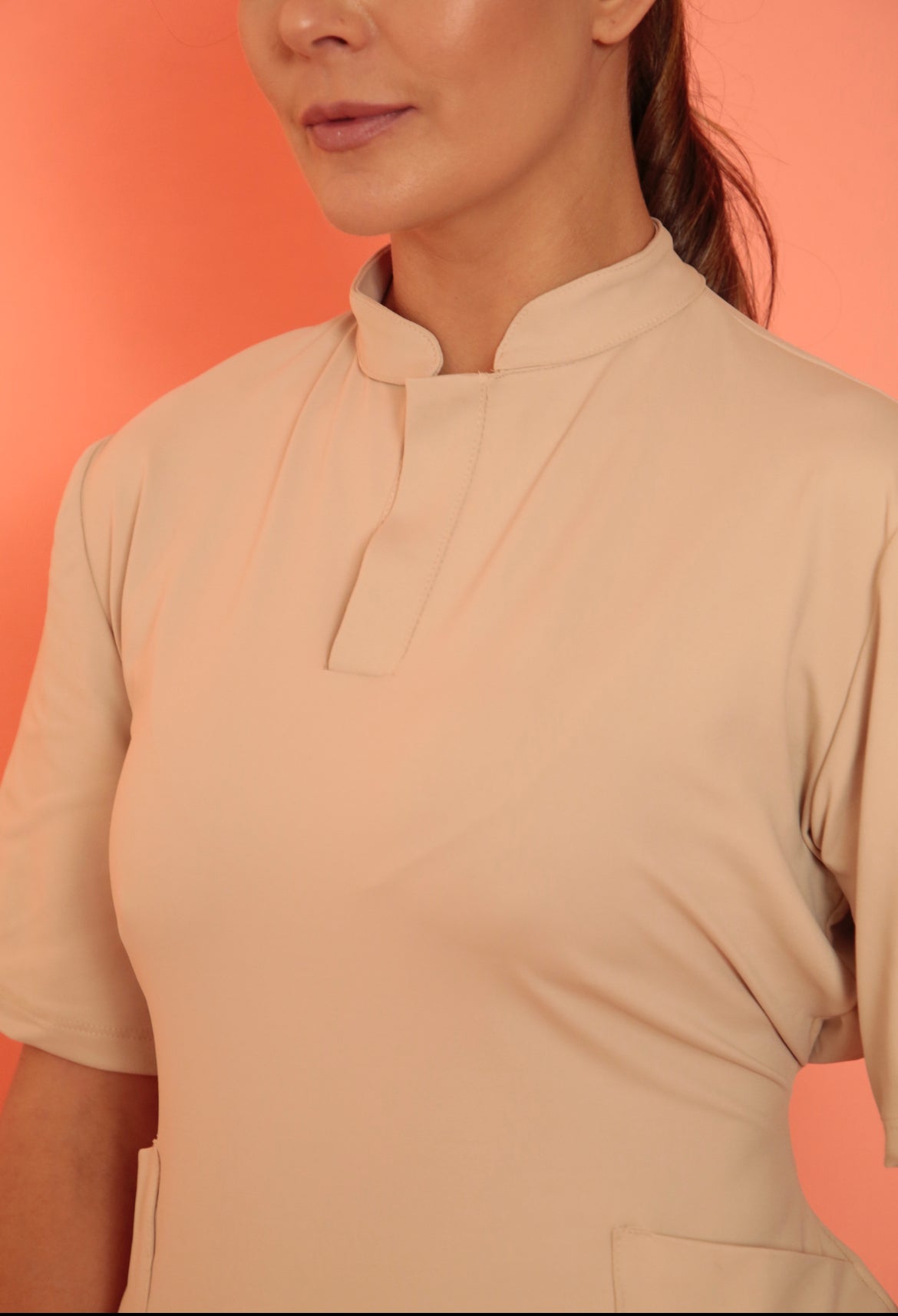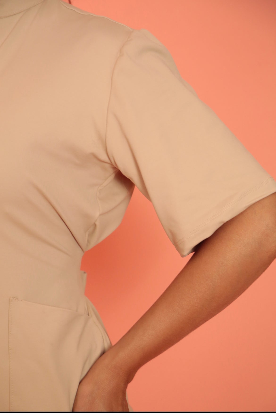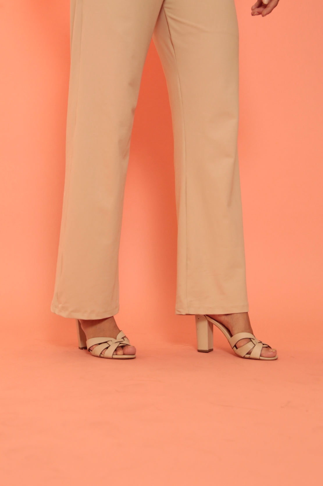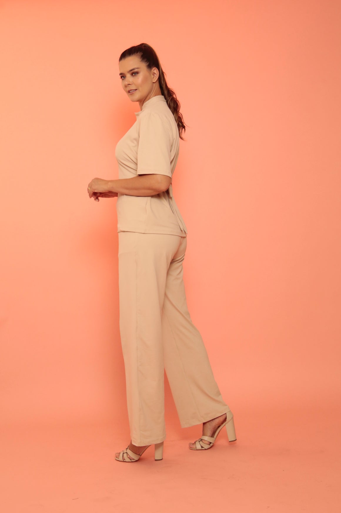 A calça modelo wide-leg mais solta e a blusa mais comprida na cor Nude deixando um estilo mais chique e elegante